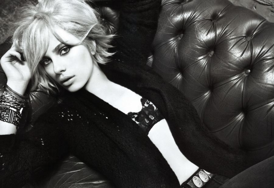 A rock chic Scarlett Johansson is seen posing for a campaign for Mango. These pictures recently surfaced on the internet with no source or information. It definitely is a new one, perhaps a Fall/Winter or an evening Spring/Summer judging from the dark hues, and edgy attire. Fitted leather waist high skirts, leopard prints, printed tees and black pumps make up the look for the collection, the campaign of which has Scarlett posing with a sultry look, thick eyeliner and a messed blonde bob. [via]
