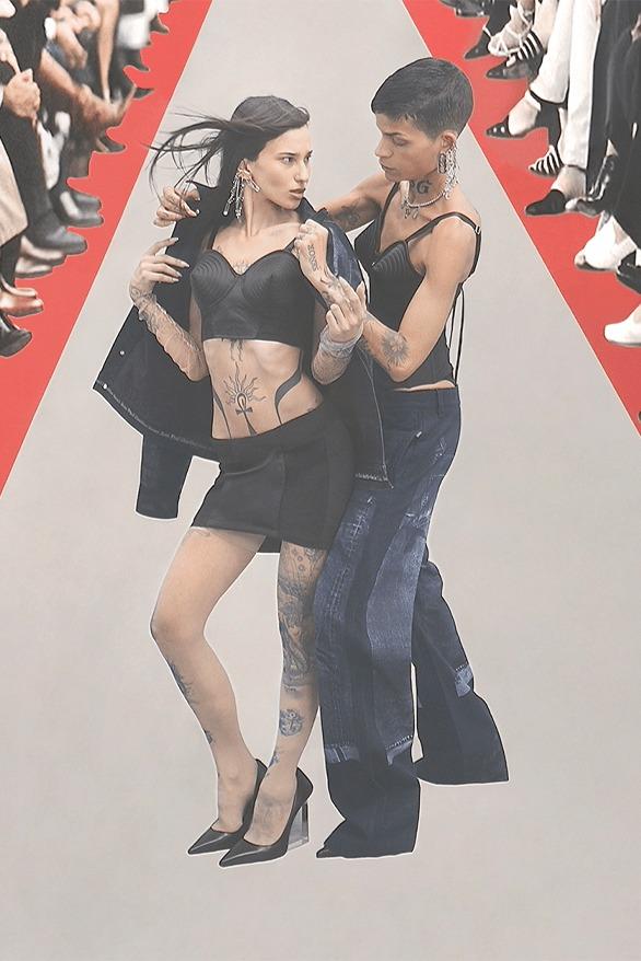 Showcased by the remarkable Omahyra Mota and Mia Kidis, the collection unveils in a symphony of skin tones. It features a spectacular array of skin-hugging tops, artistically painted with illusions of pierced breasts and adorned with the mystical allure of Japanese-inspired artwork. Imaginative expressions flourish in forms of body chains prints and playful pin-up boy drawings, creating a canvas of intriguing visual tales.